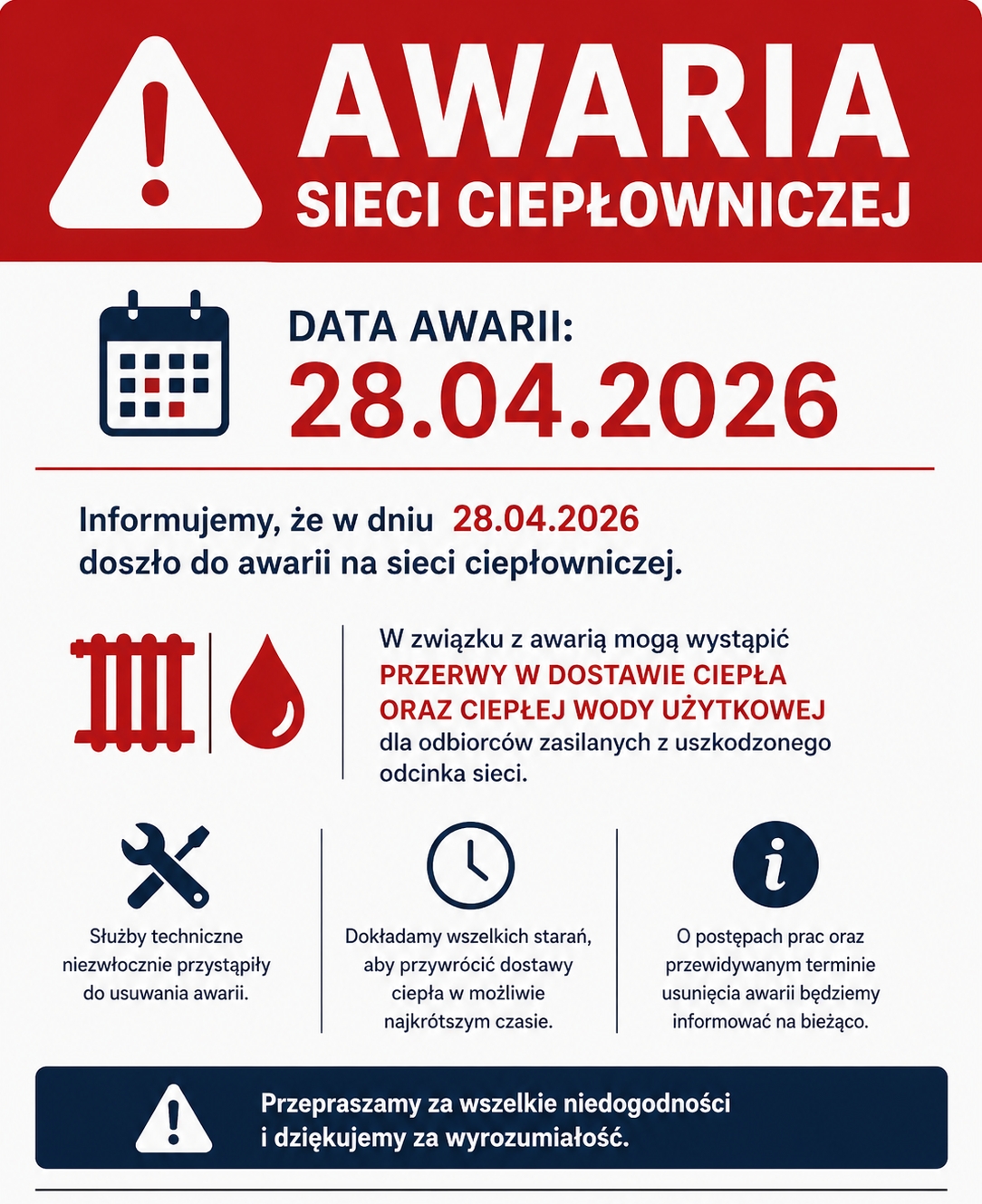 Przedsiębiorstwo Usług Komunalnych w Lipnie Sp. z o.o. informuje, że w związku z wystąpieniem awarii na ciepłowni mogą wystąpić czasowe utrudnienia w dostawie energii cieplnej. Służby techniczne pracują nad jak najszybszym usunięciem awarii i przywróceniem pełnej sprawności systemu. Przepraszamy za wszelkie niedogodności i dziękujemy za wyrozumiałość.