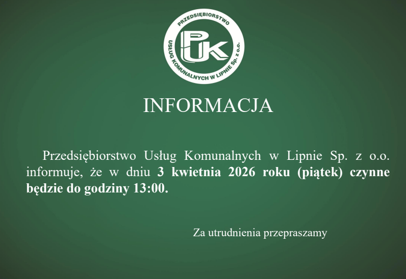 Przedsiębiorstwo Usług Komunalnych w Lipnie Sp. z o. o. wraz z Urzędem Miejskimw Lipnie, Starostwem powiatowym oraz Nadleśnictwem Dobrzejowice w dniach 10.04. oraz11.04.2026 roku zorganizowało Sprzątanie Lasu z okazji 56 rocznicy Światowego DniaZiemi.Podczas dwóch dni udział wzięło ponad 500 osób, które łącznie zebrały 358 kgodpadów.Dziękujemy za udział i cieszymy się, że nasza inicjatywa spotkała się…